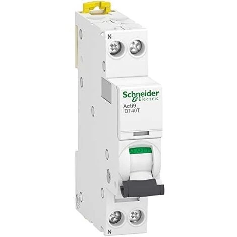 Disjoncteur modulaire iDT40T 1P+N 4A courbe C de marque Schneider Electric, gamme Acti9. Pour la commande et la protection contre les surintensités de circuit. Déclencheur magnétique.