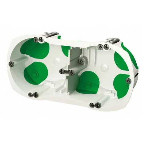 Boîte de montage double installée en encastré, fixée par vis. Elle permet le montage de différents appareillages interrupteur, bouton-poussoirs, prises…