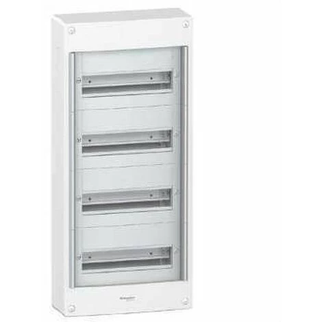 Coffret Pragma en saillie sans porte, IP30/IP40, IK08/IK09, 4×13 modules, Classe II, Double isolation, 53W, 90A, dimensions : 336x750x123mm Boîtier blanc titane et face avant en métal galvanisé. Matériel fourni : Kit de repérage, étiquette d identification, borniers.