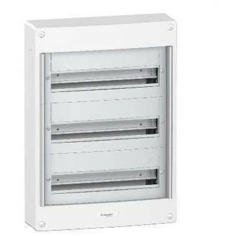 Coffret Pragma en saillie sans porte, IP30/IP40, IK08/IK09, 3×18 modules, Classe II, Double isolation, 56W, 125A, dimensions : 426x600x125mm, Boîtier blanc titane et face avant en métal galvanisé. Matériel fourni : Kit de repérage, étiquette d identification, borniers.
