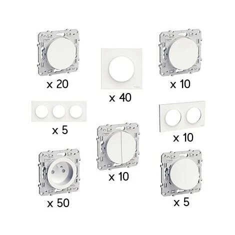 Pack Odace Blanc 95 mécanismes – 55 plaques de marque Schneider.